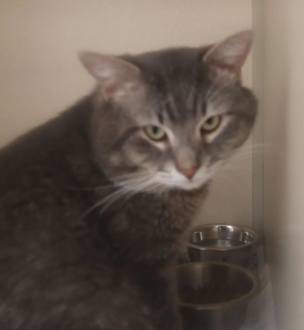 Elliot is a handsome fella he loks like a mixed Russian Blue. He is a9 year old neutered male. He is good with older children He is calm and gentle. The other cats in the house were beating him up so that is why he is at the shelter for adoption. Video on the TLC Facebook page.
