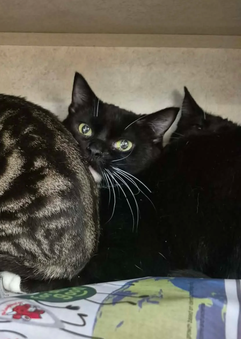 The Kit Kat Kids are about five months old all spayed and neutered. Good with children other cats. Litter box trained for adoption at the TLC Animal Shelter Homer Glen Illinois