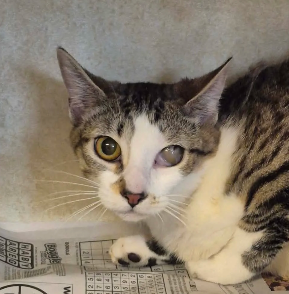 Kit and Kat are sisters. They are very sweet about 6 mos old and they both have a kitten cataract on opposite eyes, but that does not hinder them at all. They are both litter box trained. For adoption at the TLC Animal Shelter, 13016 W 151st Street, Homer Glen, Illinois